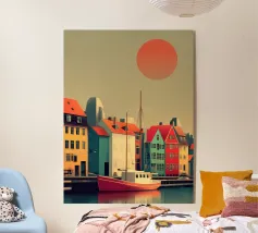 Questa immagine mostra la colorata architettura degli edifici storici di Copenhagen in uno stile moderno e geometrico. Perfetta per aggiungere un tocco di fascino scandinavo al vostro spazio.