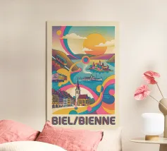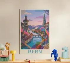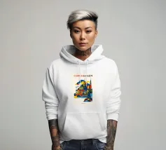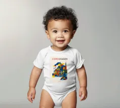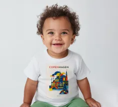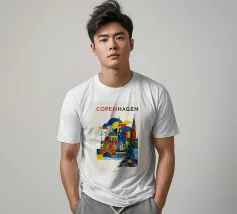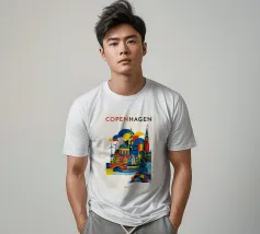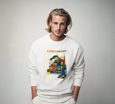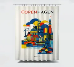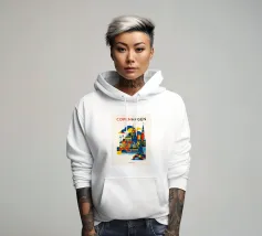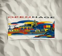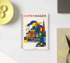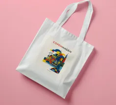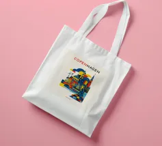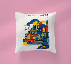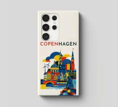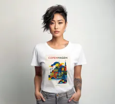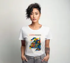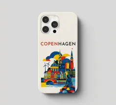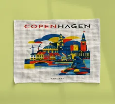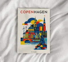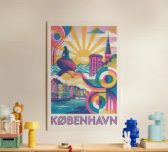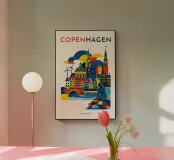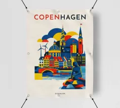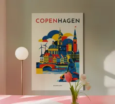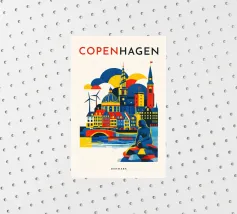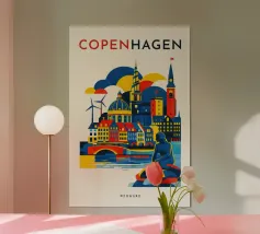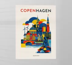A bold, graphic celebration of Copenhagen, presented through clean geometry and confident colour blocking. Iconic elements of the city rise in layered harmony, combining historic architecture, waterfront life, and contemporary symbols into a balanced, design-led composition. The scene feels calm yet vibrant, reflecting Copenhagen’s blend of tradition, innovation, and everyday livability.