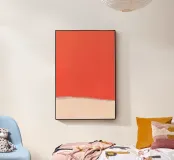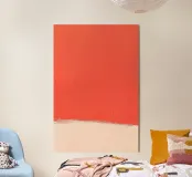 Questo astratto minimalista è definito da un ampio campo di rosso corallo saturo sospeso su un fondo morbido e cremoso. Le striature verticali del pennello increspano il piano superiore, conferendo al colore una vibrazione tranquilla piuttosto che una presenza piatta. La fascia inferiore, pallida e calda, funge da pausa, una moderazione intenzionale che bilancia l'intensità del piano superiore.