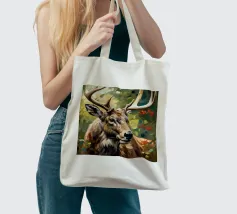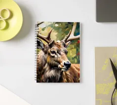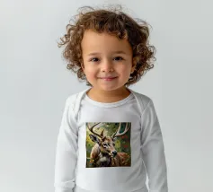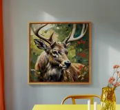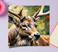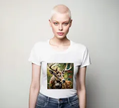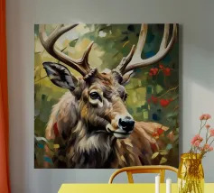 Le corna sono grandi e ramificate, ricoperte da una superficie ruvida e strutturata che cattura la luce tra gli alberi. Ogni dente si incurva naturalmente, mostrando la forza e la maturità dell'animale. Gli occhi attenti del cervo e la sua postura in bilico riflettono sia la dolcezza che l'istinto selvaggio, mentre le corna aggiungono un senso di regalità e potenza al suo aspetto complessivo.