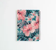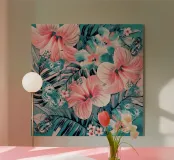 Collage di pittura digitale di un giardino tropicale in coralli vintage e verde giada con fiori di ibisco, farfalle e plumeria.