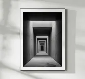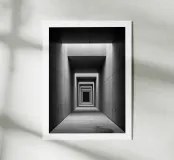 Un poster in bianco e nero di architettura minimalista: un lungo corridoio di cemento, punteggiato da lucernari, traccia una prospettiva ipnotica verso una cornice scura. Linee ripetitive, texture grezza e contrasto profondo creano una scena grafica, calma e contemporanea. Un elegante poster da parete per il soggiorno, l'ufficio o il corridoio, che amplia visivamente lo spazio e si integra con decori scandinavi, giapponesi, industriali o wabi-sabi.