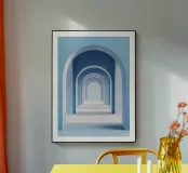 Illustration minimaliste et moderne d’une série d’arches bleues, créant une perspective infinie et apaisante. Le design joue sur des tons doux et lumineux, offrant une esthétique architecturale épurée et contemporaine. Parfait pour évoquer une ambiance de sérénité et de profondeur, ce visuel capture la beauté des lignes géométriques et des jeux d’ombres avec une élégance intemporelle.