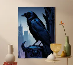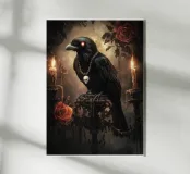 Dieses atmosphärische Artwork zeigt einen schwarzen Raben mit glühend roten Augen, der auf einem verzierten Kerzenhalter sitzt. Umgeben von brennenden Kerzen, roten Rosen und dunklen Ornamenten entsteht eine düstere, mystische Stimmung, die von feinen Licht- und Schattenkontrasten geprägt ist. Der Totenschädel-Anhänger an seiner Kette verstärkt den okkulten Charakter des Bildes. Ideal für Liebhaber von Dark-Art, Gothic-Ästhetik und symbolträchtigen Tierdarstellungen, bringt dieses Werk eine geheimnisvolle Dramatik in jede Sammlung oder Einrichtung.