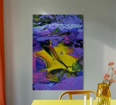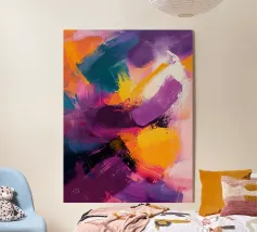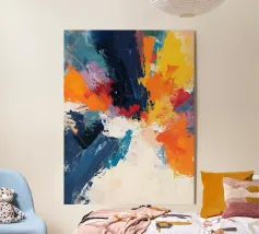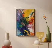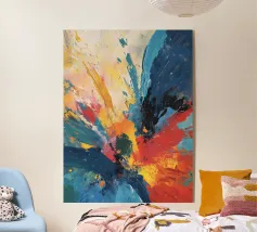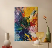 Un'esplosione di gialli radiosi, rossi infuocati, verdi profondi e blu notte che esplodono sulla tela come una supernova in piena fioritura. I tratti vorticosi e le texture schizzate catturano sia il caos che la meraviglia, riecheggiando la bellezza indomita del cosmo. Un'opera vibrante ed energica che irradia vita e movimento.
