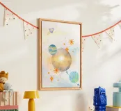 Un universo splendente e pieno di magia: questa scena colorata ad acquerello mostra un piccolo razzo, stelle splendenti e pianeti fantasiosi in un gioco cosmico di colori. Ideale per le stanze dei bambini, per gli angoli creativi o come regalo per i piccoli astronauti. Questo motivo li ispira a sognare, meravigliarsi e decollare.