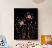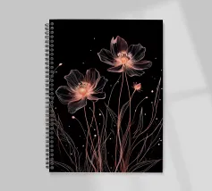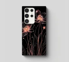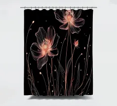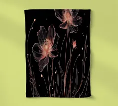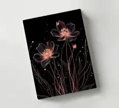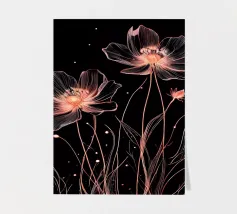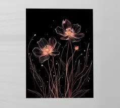 A minimalist, ethereal depiction of cosmos flowers, their delicate petals illuminated by a soft, glowing light against a dark background.