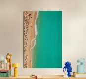 Il turchese limpido incontra la vita da spiaggia organizzata: Questa immagine a volo d'uccello mostra una composizione grafica impressionante di acqua, sabbia e ombrelloni colorati. Il perfetto equilibrio di colori, texture e leggerezza conferisce un tocco mediterraneo a qualsiasi casa. Ideale per gli amanti del design, per i nostalgici dell'estate e per chi ama le pareti in stile vacanziero.