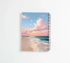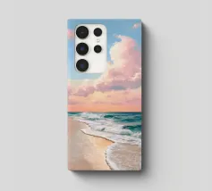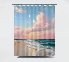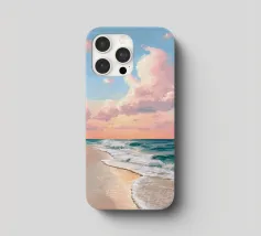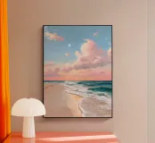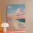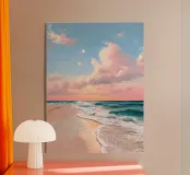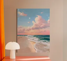 Morbide nuvole rosa si posano su dolci onde in questa sognante opera d'arte del tramonto costiero. Il cielo pastello e la costa tranquilla danno un senso di calma e di evasione, rendendola ideale per camere da letto, bagni e spazi a tema spiaggia.