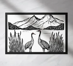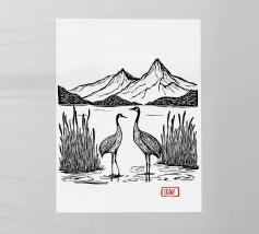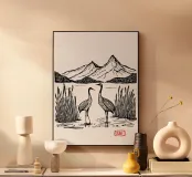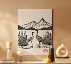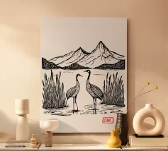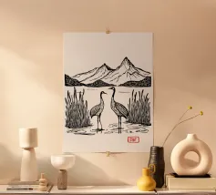 Questa elegante illustrazione in bianco e nero mostra due gru che si ergono con grazia in una calma palude, circondate da canne e sullo sfondo di una maestosa montagna. La palette di colori minimale è arricchita da accenti rossi sulla testa delle gru e dal titolo "CRANE" impresso a mano, creando una miscela armoniosa di semplicità e simbolismo. Ispirato all'arte asiatica tradizionale e al minimalismo moderno, questo poster evoca i temi dell'equilibrio, della pace e della bellezza naturale: perfetto per gli amanti della natura, per gli appassionati di uccelli o per chiunque cerchi un'opera d'arte da parete serena per la casa, lo studio o lo spazio di meditazione.