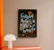 Questo poster combina una vecchia natura morta floreale con una citazione motivazionale. Colori pastello tenui e toni ricchi mostrano un bouquet di fiori sovrapposto alla scritta "Grow Through What You Go Through" in blu brillante.
