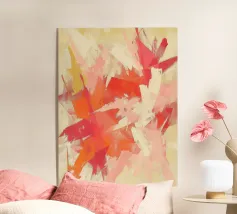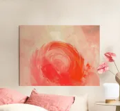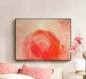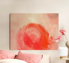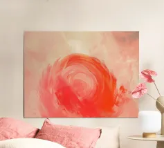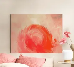 Quest'opera d'arte astratta raffigura un vortice cremisi luminoso circondato da morbide tonalità pesca e rosa cipria, che creano un senso di movimento, calore ed energia interiore. Le pennellate stratificate e i delicati effetti di luce conferiscono alla composizione profondità e una qualità rilassante e meditativa. L'equilibrio tra gli accenti rossi audaci e le tonalità pastello ariose evoca emozioni senza definire una forma o un luogo specifico. Perfetta come decorazione murale per interni moderni, scandinavi o contemporanei che cercano calore, armonia e un raffinato tocco astratto.