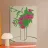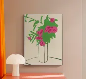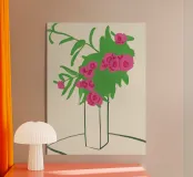 A vase with lush greenery and vibrant pink flowers is depicted against a light background. The strokes are broad and expressive, giving the composition a playful and abstract feel.