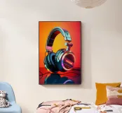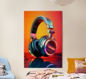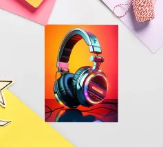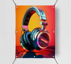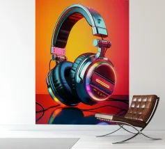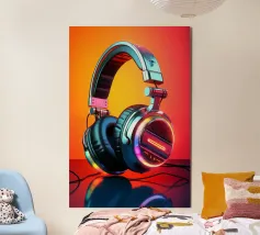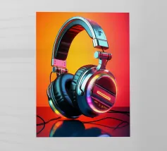 Cuffie futuristiche con accenti LED al neon in un mix di colori vivaci e un audace gradiente di colore rosso-arancio sullo sfondo. Le cuffie hanno un'elegante finitura metallica, spessi cuscinetti imbottiti e un elegante design over-ear. Un'immagine ideale per gli amanti della musica, della cultura della musica dance elettronica o per i regali e le decorazioni di ispirazione tecnologica.