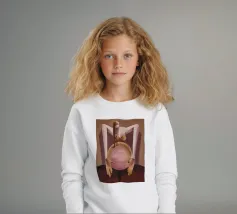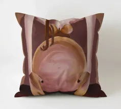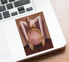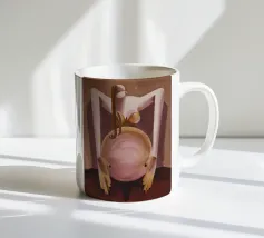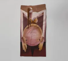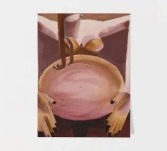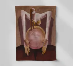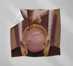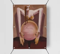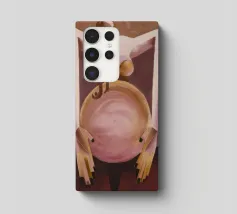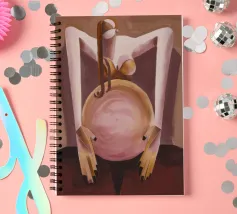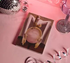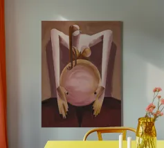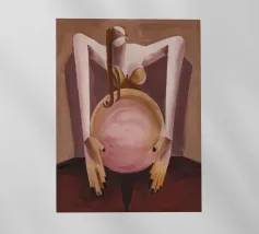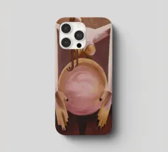 Una figura raggomitolata abbraccia un oggetto rotondo di colore rosa, incarnando tenerezza, dolore e introspezione.