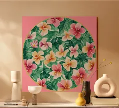 Motivo tropicale Hibiscus in stile hawaiano creato digitalmente a forma di cuore. Magenta, avorio, blu, verde e giallo, motivo vintage tropicale.