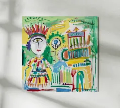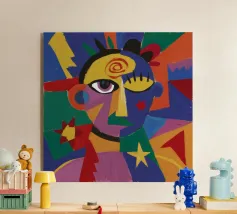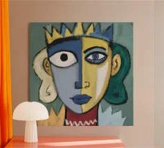 Quest'opera d'arte mostra un volto con una corona e un cuore. Lo sfondo comprende forme e motivi astratti, che conferiscono al dipinto una profondità regale ed emotiva.