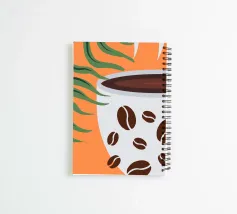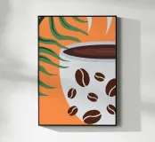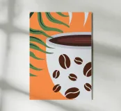 A steaming cup of coffee with coffee beans decorating the surface . Green leaves add a touch of nature to the composition.