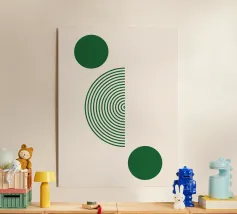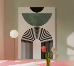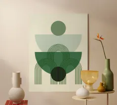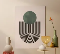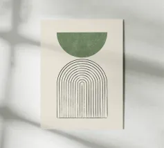 Immergete il vostro spazio nell'eleganza minimalista di questa stampa geometrica astratta, vera testimonianza di principi di design senza tempo. Quest'opera d'arte di grande impatto presenta una disposizione dinamica dei quadranti, che combina quarti di cerchio verde scuro con quarti di cerchio riempiti da accattivanti archi concentrici neri. L'interazione tra blocchi di colore audaci e intricati motivi lineari crea un senso di movimento ritmico e di sofisticato equilibrio. Questo pezzo è perfetto per aggiungere un tocco moderno ma classico a qualsiasi interno. Realizzata con eccezionale precisione digitale, questa stampa vanta una risoluzione di 7000x5000 pixel.