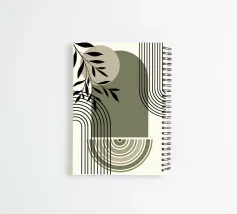 Forme geometriche astratte e linee curve creano una composizione armoniosa nei toni del verde e del nero. Un elemento botanico aggiunge un tocco organico tra le forme strutturate.