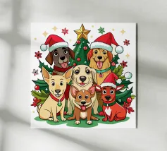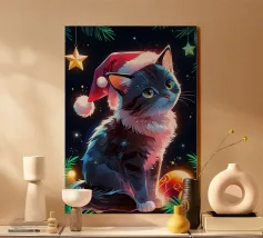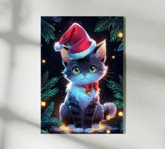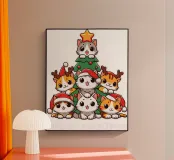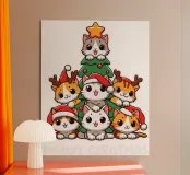 Adorable cartoon cats are stacked in the shape of a Christmas tree, complete with festive hats and a star on top. Below them, the phrase "Meowy Christmas" adds a playful holiday greeting.