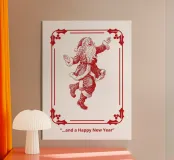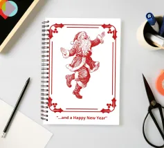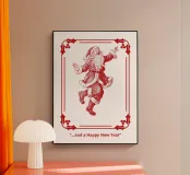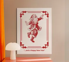 Incisione vintage di un Babbo Natale felice in una cornice di agrifoglio rosso.