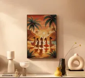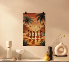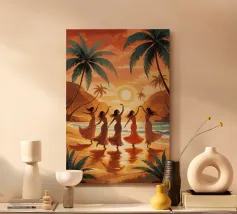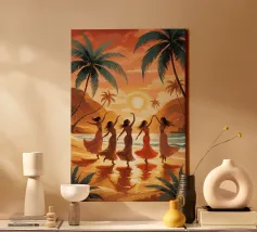Immerse nel tramonto dorato, cinque donne si muovono con grazia lungo la spiaggia, i loro abiti catturano la calda brezza dell'oceano. Il sole al tramonto si riflette sull'acqua, creando una scena luminosa e onirica. Palme e scogliere tropicali si ergono alte, incorniciando la gioiosa celebrazione della vita e del movimento. La loro danza armoniosa incarna la connessione tra femminilità, natura e libertà, catturando la serenità di un paradiso incontaminato dal tempo.