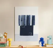 Quest'opera d'arte raffigura una casa minimalista e astratta con pennellate decise nei toni del blu e del bianco. La casa è divisa in due parti: una parte inferiore di colore blu più scuro, con una piccola porta e una finestra bianca, e una parte superiore che assomiglia a un tetto, dipinta con strisce verticali blu e bianche. La struttura poggia su un terreno chiaro e strutturato che si fonde con lo sfondo bianco, conferendo all'immagine un'atmosfera sognante e surreale. Lo stile è moderno ed espressivo, evocando un senso di semplicità e mistero.