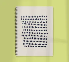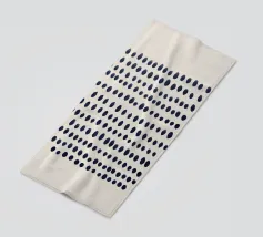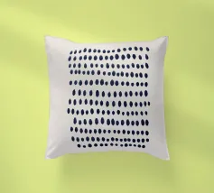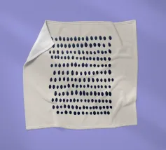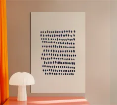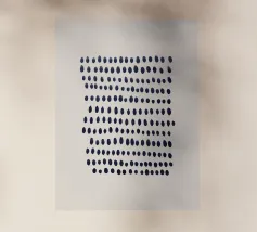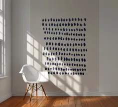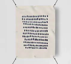 Composizione astratta di punti blu scuro dipinti a mano e disposti in file orizzontali leggermente irregolari. I punti variano sottilmente in forma e dimensione, creando un senso dinamico di ritmo e movimento. Il motivo è inserito in uno sfondo beige neutro, che conferisce al pezzo un'atmosfera moderna e organica.