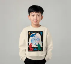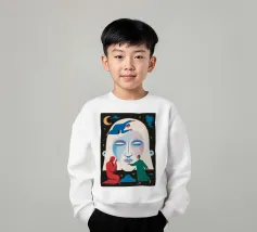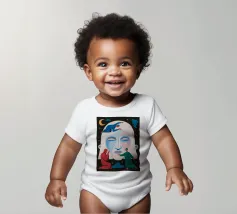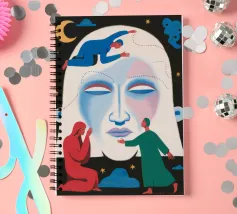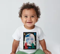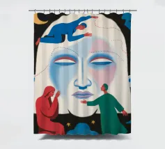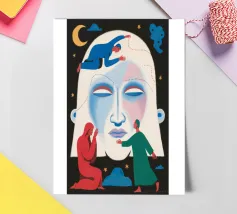 Questa opera d'arte mostra due figure, una rossa e una verde, che danzano sotto un arco con lune e stelle. Lo sfondo è blu scuro e rende l'atmosfera celestiale e mistica della scena.