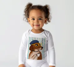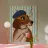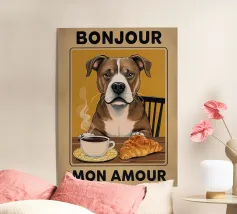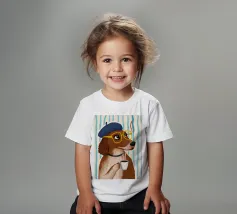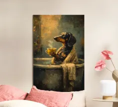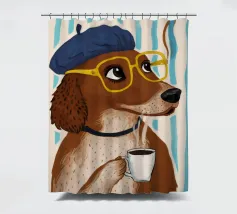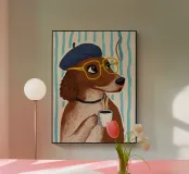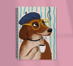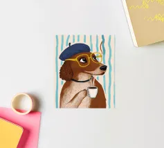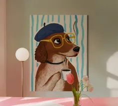 Illustrazione stravagante di un cane marrone che indossa un berretto a righe bianche e blu e occhiali rotondi, sorseggiando con calma da una tazza di caffè, emanando un fascino fresco, sofisticato e spiritoso su uno sfondo blu chiaro con linee di vapore.