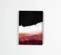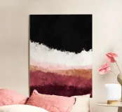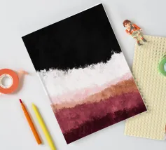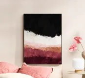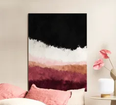 Una composizione astratta contemporanea strutturata in strati orizzontali. Il nero intenso occupa la parte superiore, sfumando gradualmente nel bianco, nel rosa cipria, nel beige caldo e nei ricchi toni bordeaux della parte inferiore. L'opera evoca un orizzonte o un paesaggio astratto senza diventare letterale. La texture rimane morbida e diffusa, conferendo profondità all'opera senza geometrie nette.