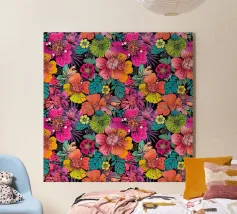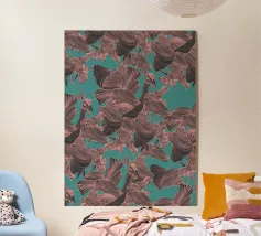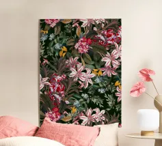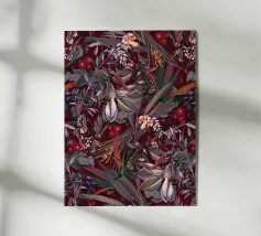 Un lussureggiante motivo botanico vintage con fiori e foglie tropicali di colore verde acqua, arancione, verde oliva e crema su uno sfondo scuro. Questo disegno ispirato alla giungla ha una qualità di illustrazione vintage con elementi botanici dettagliati e toni terrosi. Perfetto per gli amanti delle botaniche scure, per gli appassionati del vintage tropicale, per i fan dell'estetica umorale e per tutti coloro che apprezzano i fiori ricchi e sofisticati con un'atmosfera misteriosa da giardino esotico.
