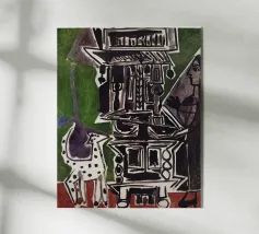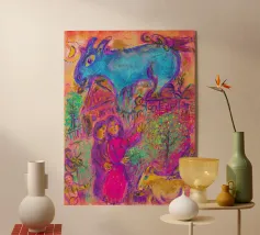 This lithograph by Marc Chagall illustrates a biblical scene, likely depicting King David escaping through a window while his wife Michal stands guard. Executed in Chagall’s characteristic blue, gray, and white palette, it captures a moment of drama, loyalty, and passion. The dreamy, floating figures and simple architectural setting convey a timeless, emotional narrative.