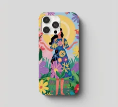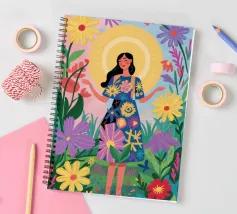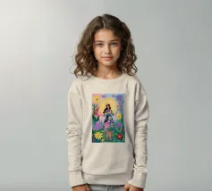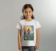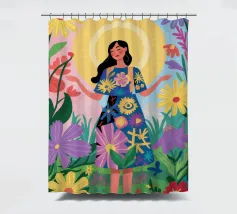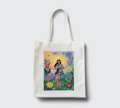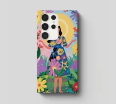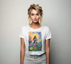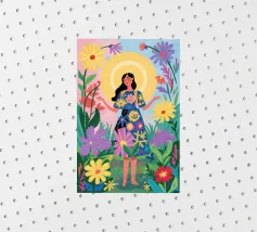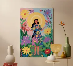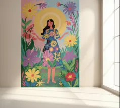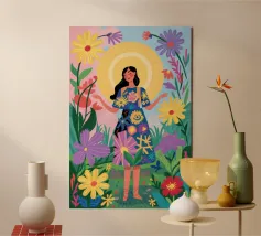 Una donna si erge come una dea in un campo di fiori vibranti, con un bouquet in mano e un'aureola solare alle spalle, che celebra la femminilità e l'abbondanza della natura.