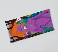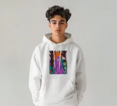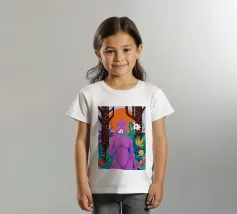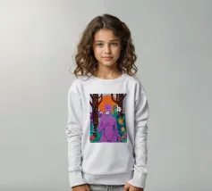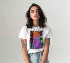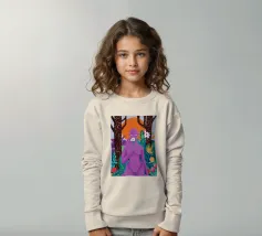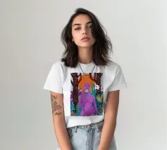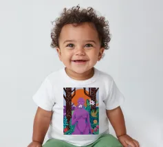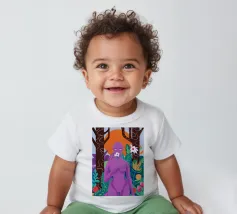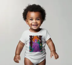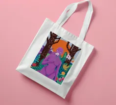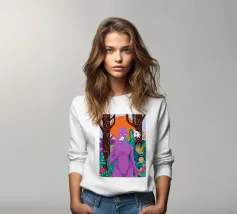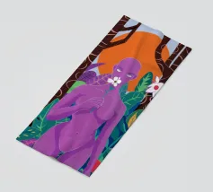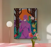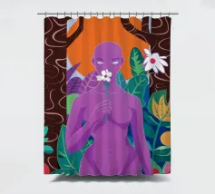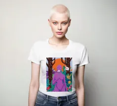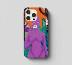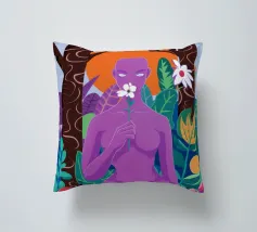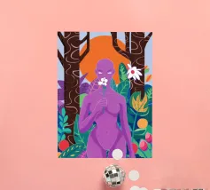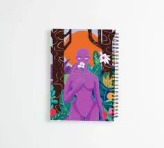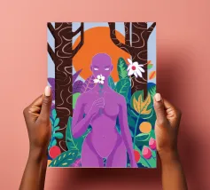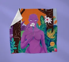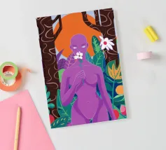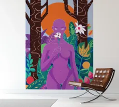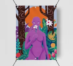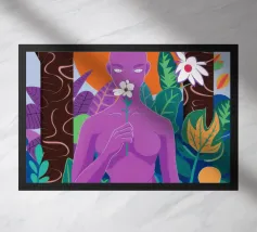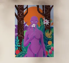 Un ritratto surreale di una donna dalla pelle viola, che rappresenta una dea della natura, circondata da fiori e piante sotto una luna crescente. L'opera è mistica, potente e una splendida celebrazione dell'energia femminile e della natura.