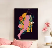 Una bella e surreale illustrazione di una figura femminile nuda è intrecciata con fiori in fiore, che la ritraggono come una dea della natura aggraziata e potente.