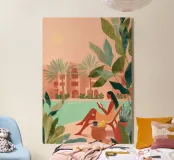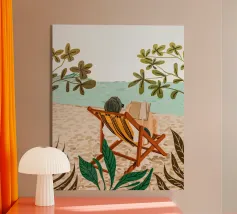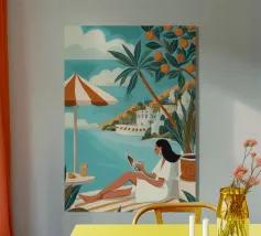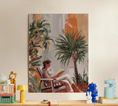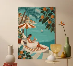 Nella calma dorata di un'oasi nel deserto, una donna siede a bordo piscina, immersa nel suo libro, incorniciata da un'abbondante vegetazione e da un'architettura tranquilla. La calda tavolozza di terracotta e il sole gentile evocano quiete e solitudine, mentre la scena sussurra di mattinate lente e pomeriggi senza tempo. Con un caffè, limoni e la quiete come unica compagnia, l'autrice diventa un ritratto della pace interiore, un momento sospeso tra i capitoli, sia letterari che personali.