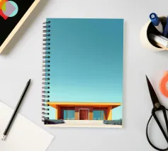 Una casa moderna e simmetrica si staglia audace sotto un cielo turchese infinito. Il vivido contrasto tra la facciata arancione bruciato e il cielo fresco e aperto evoca serenità, precisione e calore. Questo ritratto architettonico celebra il minimalismo, l'equilibrio e la quiete di un pomeriggio assolato.