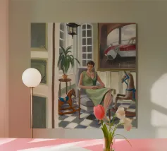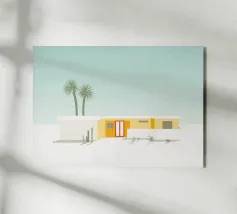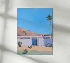 Un dipinto che mostra un edificio bianco della metà del secolo scorso con una sorprendente porta arancione, inserito in un paesaggio desertico con vari cactus e palme sotto un cielo luminoso e soleggiato.