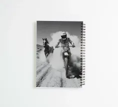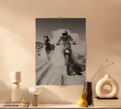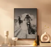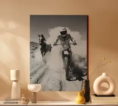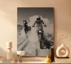 Una dinamica ripresa in stile vintage di un motociclista che corre su un terreno polveroso con un cavallo che corre al suo fianco. Audace, energica e ricca di tensione cinematografica.