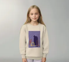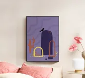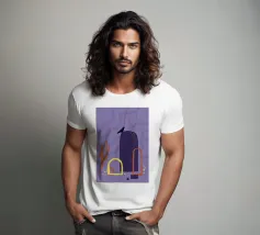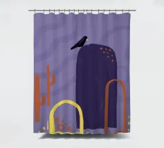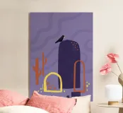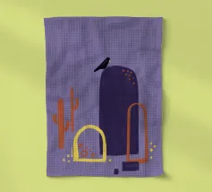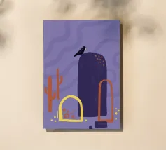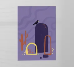 Campi, cactus e un corvo solitario. Motivo illustrativo in viola, arancione e giallo.