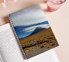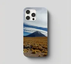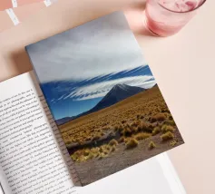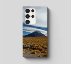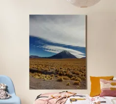 Paesaggio del deserto di Atacama in Cile, con una maestosa montagna sotto un cielo blu brillante e fiori colorati in primo piano. Una foto rara che cattura lo spettacolare contrasto tra l'aridità del deserto e la vitalità della flora. Ideale per decorazioni murali, viaggi e ispirazioni naturalistiche.