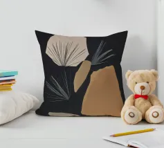 An abstract composition of desert-toned paper fragments and fine pine-needle forms arranged on stark black. The matte textures and restrained palette evoke a minimalist fossil record—layered, clean, and deeply rooted in organic form.