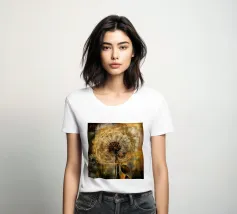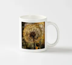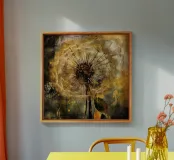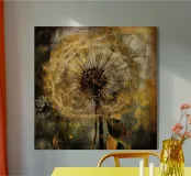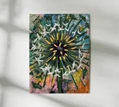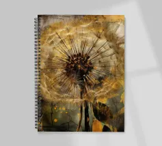 Una moderna illustrazione astratta, che mescola collage e texture, presenta denti di leone dorati su uno sfondo grunge beige, marrone e oro. I denti di leone appaiono rovinati dalle intemperie e frammentati, con le loro delicate teste di semi che sembrano andare alla deriva in un caotico paesaggio urbano. La consistenza consumata e rovinata dello sfondo aggiunge profondità, creando un senso di decadenza e distruzione. Elementi audaci e astratti si scontrano con le forme organiche dei denti di leone, creando un contrasto sorprendente. Questo pezzo cattura la bellezza della fragilità della natura in mezzo all'energia cruda e tagliente della vita urbana moderna.