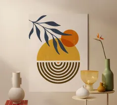 Questo motivo boho minimalista mostra un caldo sole serale su onde stilizzate, completato da delicati elementi a foglia. I toni terrosi dell'arancione e il blu tenue creano un disegno armonioso che irradia calma e naturalezza. Perfetto come murale, cuscino o tazza, questo disegno aggiunge un tocco artistico e moderno a qualsiasi ambiente. Portate calore e stile nella vostra casa con questo accento decorativo senza tempo.