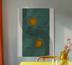 Design astratto e minimalista con forme geometriche in marrone, verde menta, rame e nero. Un grande cerchio di rame a sinistra, linee verticali sottili e superfici strutturate ricordano la pietra o il marmo. Disposte in modo armonico con un'estetica moderna e chiara.