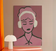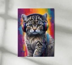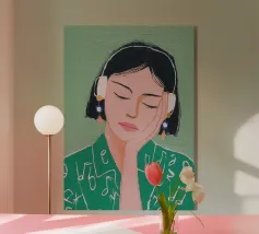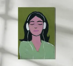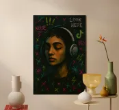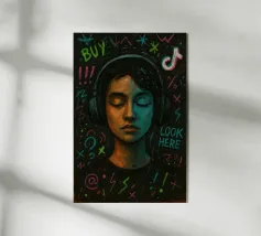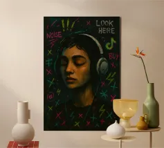 Un soggetto pensieroso indossa le cuffie in mezzo a un turbinio di graffiti al neon: "NOISE", "LOOK HERE", un simbolo @ e un'icona TikTok. Le pennellate scure ancorano la composizione, mentre gli spruzzi di verde elettrico, rosa e giallo imitano il bombardamento digitale. Questo commento viscerale sul sovraccarico dei media e sui tempi di attenzione ridotti evoca la tensione tra introspezione e rumore esterno. Stampata su carta opaca d'archivio pesante, l'opera domina qualsiasi spazio - studi, salotti o dormitori - invitando gli spettatori a interrogarsi sulla colonna sonora della propria vita e a trovare la quiete nella staticità.