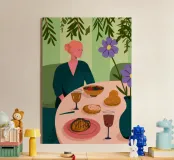 Questo dipinto illustra una persona seduta a un tavolo da pranzo con vari cibi e bevande, tra cui pane, vino e una ciotola di zuppa. Lo sfondo è caratterizzato da grandi foglie e fiori verdi.