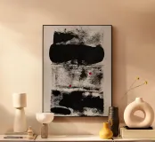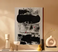 "Direction" gioca con l'orientamento e l'inquietudine allo stesso tempo. Le superfici nere appaiono potenti, quasi architettoniche, mentre piccoli accenti rossi indicano la strada. È un quadro sulla ricerca - di direzione, chiarezza e significato - e sulla bellezza che si cela in questo processo.